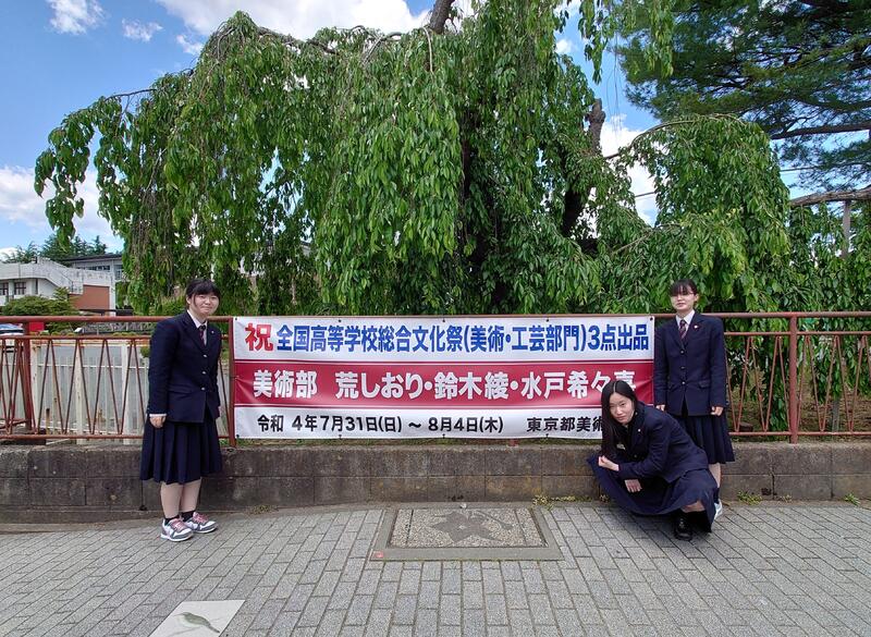 荒しおりさん、水戸希々嘉さん(ともに3年1組)、鈴木綾さん(3年2組)の作品が、7月31日(日)から行われる「とうきょう総文2022」に出展されます。県代表として全国総文祭に3作品も選出されることは快挙で、そのことを祝して本校の校門前に横断幕が掲示されました。美術・工芸部門の作品は、7月31日(日)~8月4日(木)まで上野公園内にある東京都美術館に展示されます。